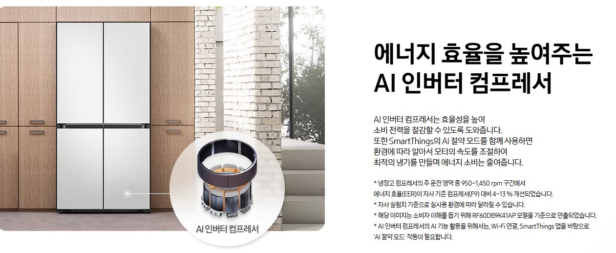 거기에 추가로 에너지 효율을 높여주는 AI 인버터 컴프레서로 에너지 효율을 높여 소비전력을 절감할 수 있도록 도와준답니다.